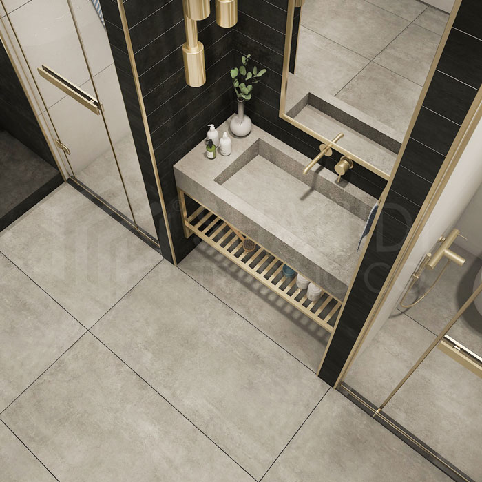 سرامیک پرسلان پما Contemporary در سایز 120*60 با رنگ سفید، طوسی روشن و طوسی تیره و طرح بتن و سطح مات طراحی و تولید شده است.
