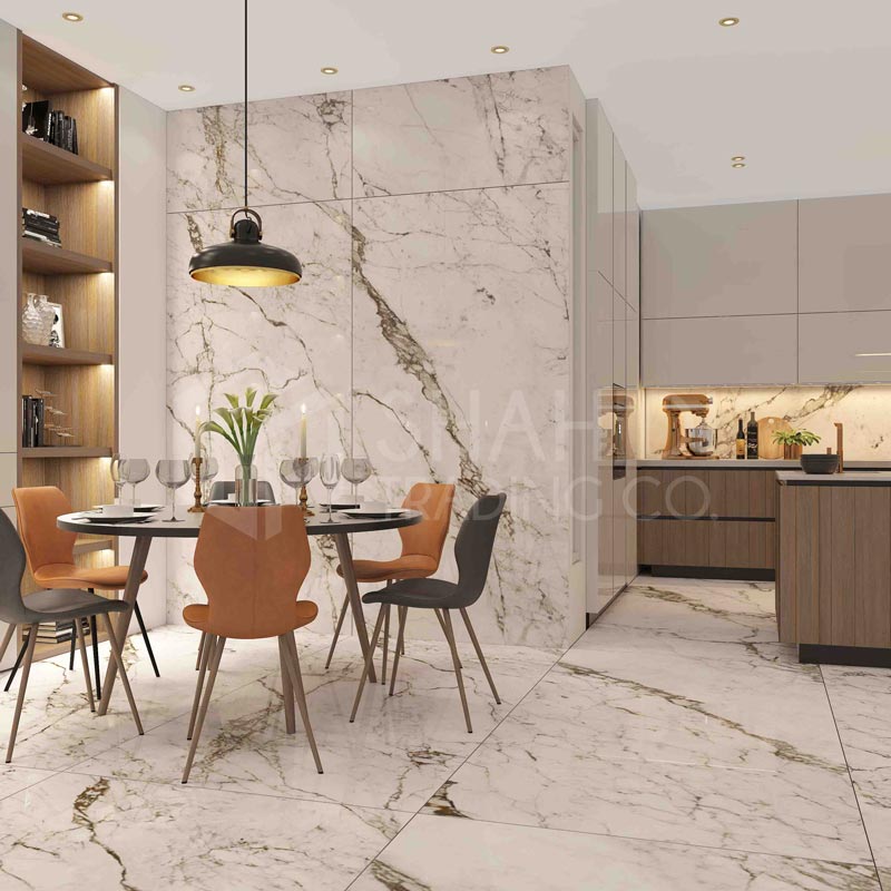 کالکشن گلد سوپریم Gold Supreme از اسلب سروکوارنتا در سایزهای 1.20x2.40 و 1.20x1.20 با سطح صاف پولیش و طرح کلکته گلد (رنگ سفید همراه با رگه های طوسی و سفید) طراحی و تولید شده است.