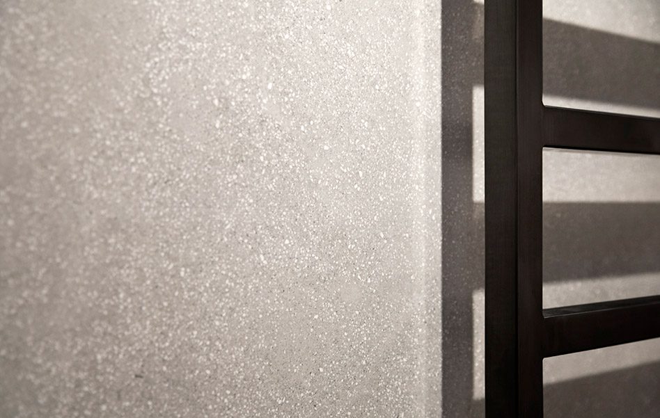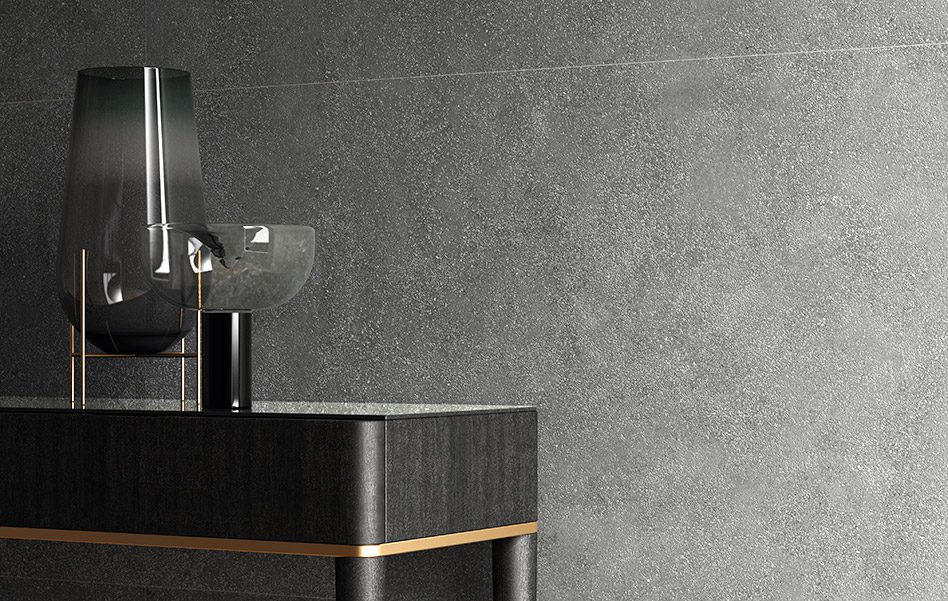 سرامیک پرسلان سروکوارنتا سری لاوا Lava در سایز 120*60 با سطح صاف مات با طیف رنگی طوسی روشن تا تیره و در 3 رنگ و طرح موزاییکی قدیم برای تمامی فضاها اعم از کف و بدنه (دیوار) سرویس، آشپزخانه و بینکابینتی، کف سالن، دیوار محوطه استخر، نمای بیرونی ساختمان، کف لابی، دیوار راهپله و Tv Room طراحی و تولید شده است.